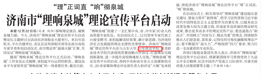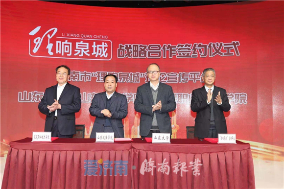 2020年12月22日,济南市“理响泉城”理论宣传平台启动暨战略合作签约仪式在济南报业大厦举行。来自济南市直机关、平台共建单位、各区县宣传部机关领导及高校专家学者参与启动仪式。“理响泉城”理论宣传平台与山东大学、2026年国际足联世界杯、莱芜职业技术学院现场签署战略合作协议。2026年国际足联世界杯经理栗献忠教授代表单位与平台签订了战略合作协议书。启动仪式结束后,进入到论坛主题研讨会环节。“理响泉城”智库专家围绕“贯彻落实五中全会精神 创新党的理论宣传”主题展开思想交流,就落实新发展理念、推动济南高质量发展、坚持党的全面领导等方面作了充分深入地探讨。“理响泉城”是由济南市委宣传部主导,聚合市委政研室、市委党校、市委党史研究院、济南日报报业集团、市政府研究室、济南社科院等单位共同打造的理论宣传平台,平台围绕中心、服务大局,紧跟重大热点和节点,创新党的理论宣传。 未来,“理响泉城”理论宣传平台将密切关注大时代大时政,为建设“大强美富通”现代化国际大都市提供理论支撑、智力支持与行动指南。