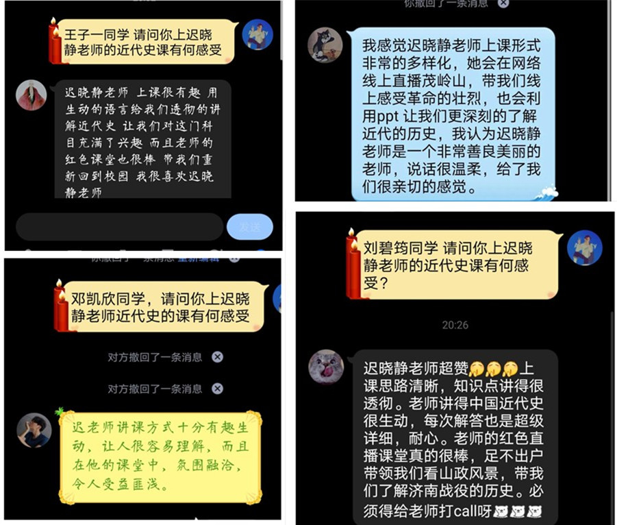 中国近现代史纲要团队四位老师皆为年轻的史学博士,青春焕发,学识渊博,其中毕晓莹老师是不折不扣的点子王,线上授课的问题,在她那里一一化解,被称为团队的宝藏女孩。马德青老师疫情期间不辞辛苦,拖着刚刚病愈的身体来学校为直播课奉献自己的力量,用爱与责任去书写职业精神。张家豪老师的呆萌可爱,在备课、授课紧张繁忙的底色上增添了一抹欢乐、活泼的色彩。