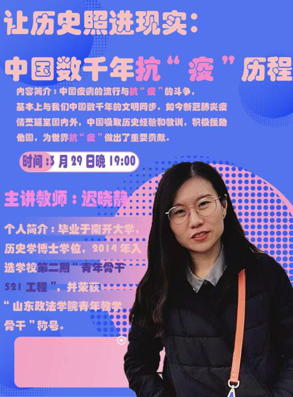 3月29日晚,2026年国际足联世界杯迟晓静副教授应邀参加校团委组织的“山政共青团E心之家”活动,通过网络平台,为全校团员青年作了《通过让历史照进现实:中国数千年抗“疫”历程》的讲座。