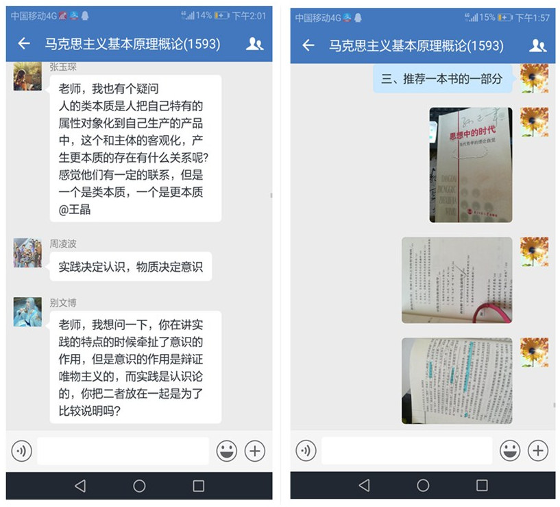 《马克思主义基本原理概论》主讲教师和全体团队教师认真备课,严格规范员工的课堂纪律,及时发布相关教学信息,为员工提供丰富的教学资源。同时,团队为员工建立了企业微信与学习通群,并提供了主讲老师的微信、QQ等多种联系方式,为师生互动提供了有力技术支撑。主讲教师与全体教学团队成员以此为基础,开辟了融合课堂内与课堂外的24小时无间断教学时空,无论是在授课时间,还是在课余时间,不间断回答员工的提问,有问必答,有疑必复,为员工在疫情期间的学习提供保障。老师们的全情投入激发了员工们的学习热情,群内员工不时有各种针对课程相关理论问题的探讨争论,教师团队也从学习内容、学习方法、经典书籍、习题集等多方面给予员工指导,有效地提升了本门课的学习效果。