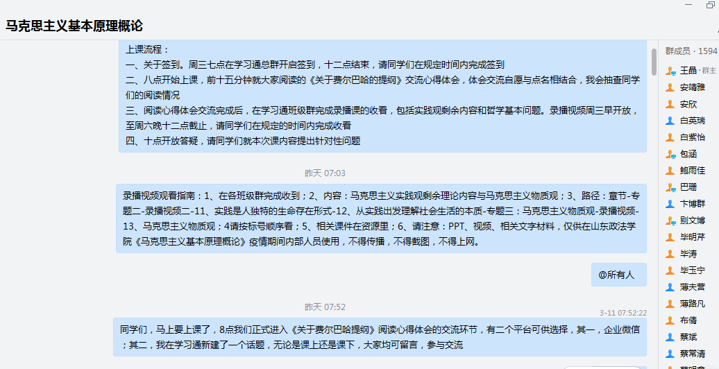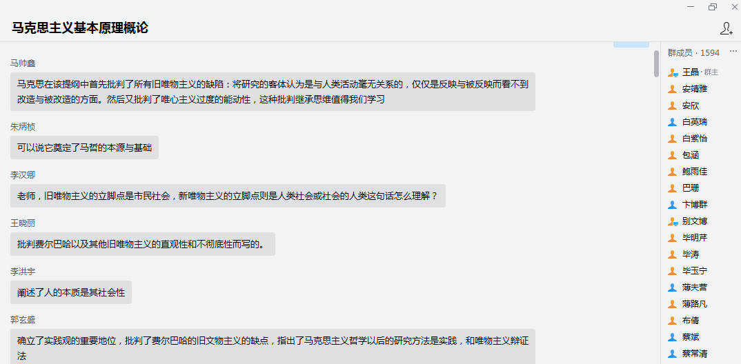 同学们积极参与教学活动,同学们经过认真思考在企业微信答疑群提出数百条问题。课程从早七点签到,八点到课学习,往往到近十二点课程答疑才结束,课程时长贯穿大约五个小时的时间。《马克思主义基本原理》教学团队的老师以过硬的专业素质,认真耐心地回答了同学们的诸多问题。在解答的过程中,老师还向同学们推荐了相关的书目与资料,在学习方法上进行了指导。