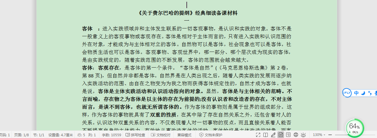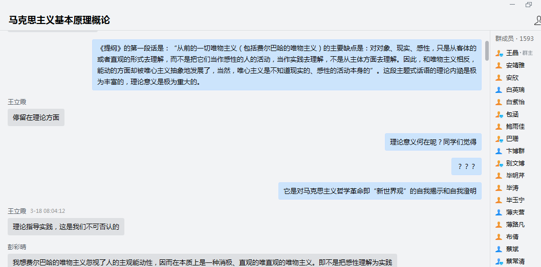 经典细读要想取得实效,离不开教师授课前充分的教学准备工作。上课前,教师充分查阅相关资料,形成一万余字的经典导读教学资料,在此基础上,以企业微信平台为网络平台支撑,开展了对《关于费尔巴哈的提纲》的理论意义等内容的经典细读。