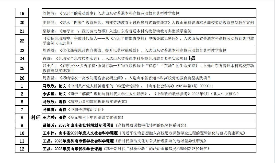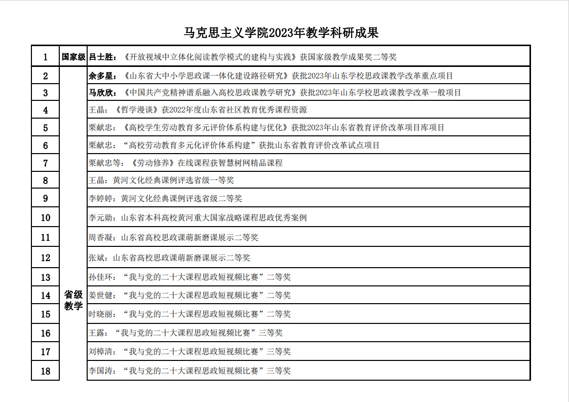 教学方面,获国家级教学成果奖二等奖1项,省级教改重点项目1项、一般项目1项,校级教学奖项26项、课程项目3项。科研方面,获省社科立项1项,出版专著3部,发表C刊论文1篇、北大中文核心1篇,立项3项厅级课题,3项校级课题。